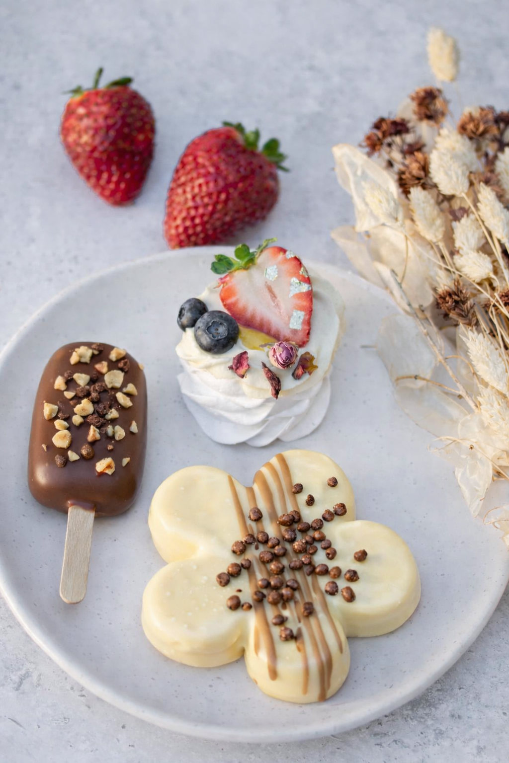 - 1 x cvetlica: domači masleni piškotek, jagodni ganaš, pasijonkina sredica, preliv jagodne čokolade Valrhona, jedilno cvetje in zlati lističi