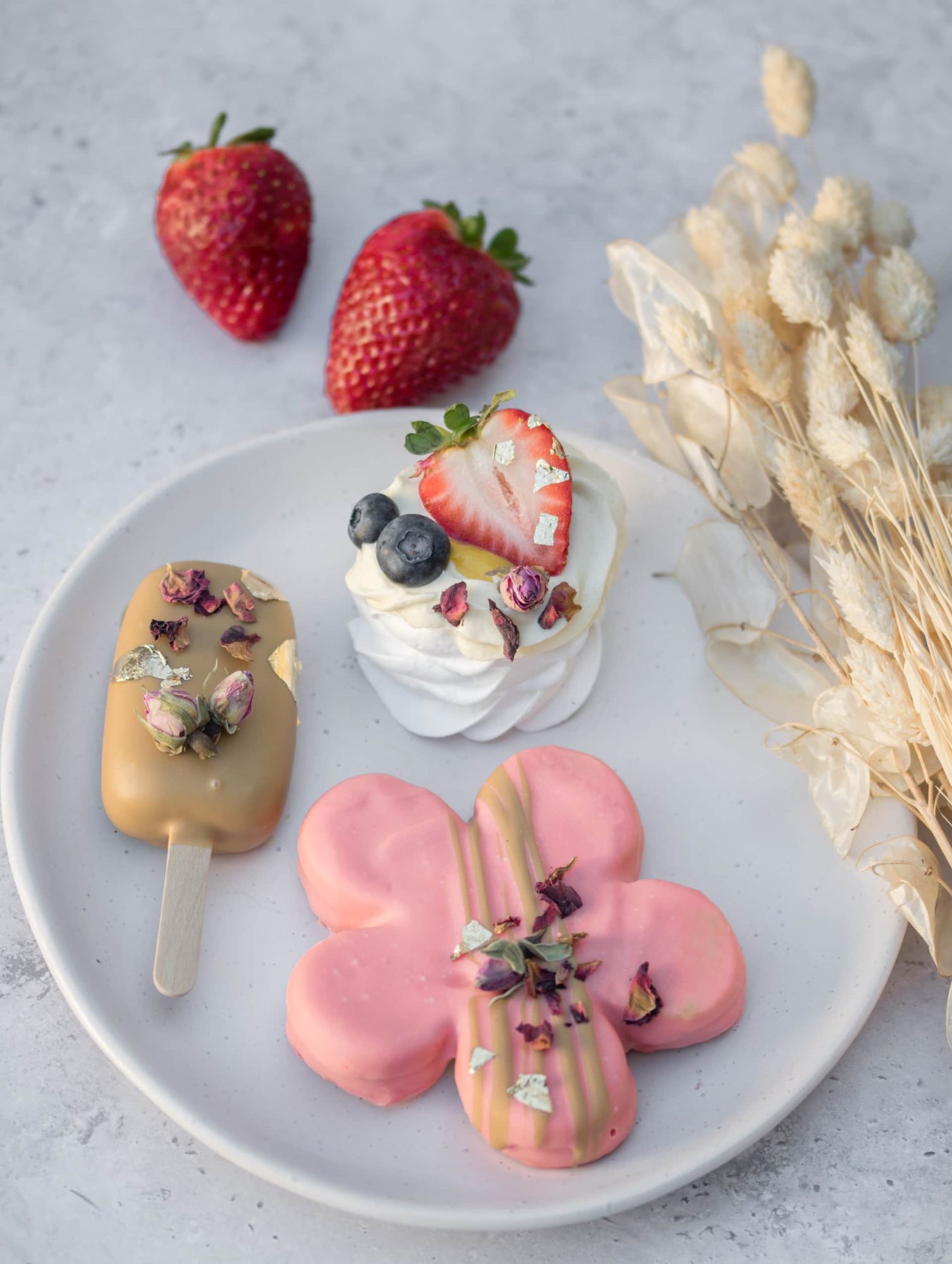 - 1 x cvetlica: masleni piškotek, jagodni ganaš, pasijonkina sredica, preliv jagodne čokolade, jedilno cvetje in zlati lističi